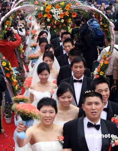 11月2日,重慶農(nóng)民工日,重慶市為當?shù)剞r(nóng)民工舉行集體婚禮,30對進城務(wù)工青年在眾多市民見證下結(jié)為連理。從2007年開始,重慶市將每年11月的第一個星期日設(shè)為“重慶農(nóng)民工日”,以紀念農(nóng)民工對該市社會和經(jīng)濟發(fā)展所做的貢獻。中新社發(fā) 郭晉嘉 攝