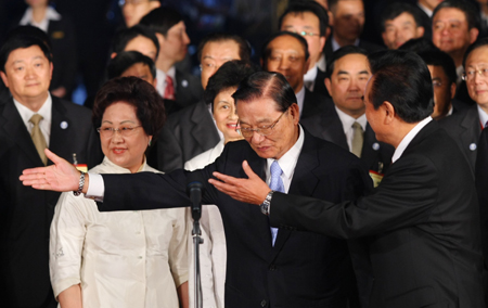 大陸海協(xié)會(huì)會(huì)長(zhǎng)陳云林(前右)三日率協(xié)商代表團(tuán)來(lái)臺(tái),在臺(tái)北圓山飯店致詞后,與;鶗(huì)董事長(zhǎng)江丙坤(前右二)相互禮讓。