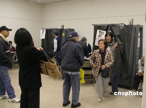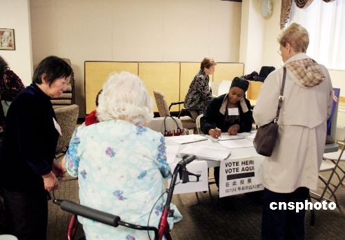 美國(guó)東部時(shí)間4日,美國(guó)總統(tǒng)選舉投票開始.在紐約新華裔移民聚居地法拉盛地區(qū)投票點(diǎn),不僅有中文“在此投票”的說明,更配有專職中文翻譯,可幫助講廣東話、福州話乃至上海話的居民順利投票。中新社發(fā) 魏晞 攝