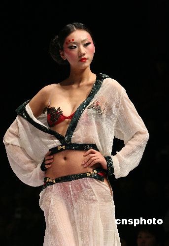2008年11月5日,中國國際時(shí)裝周(2009春夏系列發(fā)布)開幕式——2008中華內(nèi)衣元素創(chuàng)新設(shè)計(jì)大賽在北京舉行。 本次大賽共收到全國27個(gè)地區(qū)(包括港澳臺)和英國、日本的872組參賽作品,經(jīng)過評委的認(rèn)真評選,來自中國內(nèi)地、中國臺灣、英國和日本的24組參賽作品入圍。來自不同國家和地區(qū)的選手們從各個(gè)角度對漢代文化進(jìn)行各自的詮釋,將漢代文化的多元與繁榮表現(xiàn)地淋漓盡致。中新社發(fā) 魯谷 攝
