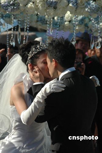 圖為婚禮上楊威準備吻新娘楊云,演繹極度浪漫。中新社發(fā) 尹海明 攝