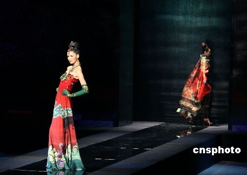 2008年11月9日,中國(guó)國(guó)際時(shí)裝周(2009春夏系列)在北京舉行鄧皓2009春夏時(shí)裝發(fā)布,莫萬(wàn)丹、劉多兩大名模傾情演繹,臺(tái)上相互爭(zhēng)艷。中新社發(fā) 魯谷 攝