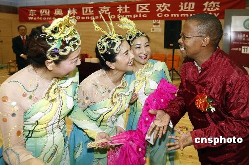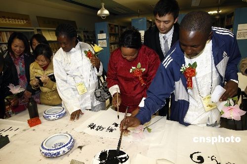 圖為非洲友人向市民學(xué)習(xí)中國書法。