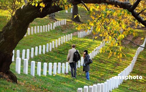 圖為一對(duì)市民在阿靈頓國(guó)家公墓憑吊埋葬在這里的親友。中新社發(fā) 邱江波 攝