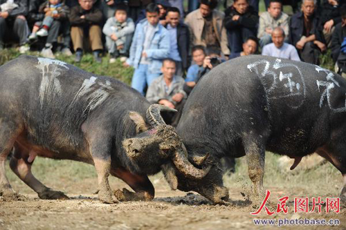 11月11日,貴州雷山縣苗族同胞迎來(lái)了一年一度的苗年節(jié),在雷山縣城河灘上,苗族同胞舉行斗牛斗豬比賽歡度苗年節(jié)。(吳東俊)