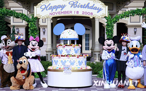 11月18日,東京迪斯尼樂園為恰逢80壽誕的動畫明星米老鼠米奇舉行生日會。米奇的女朋友米妮、唐老鴨等迪斯尼明星和10名來自日本各地的與米奇同一天生日的嘉賓參加了生日會,他們?yōu)槊灼鎺砹藲g樂的生日歌及一個(gè)高約2米的巨大蛋糕。