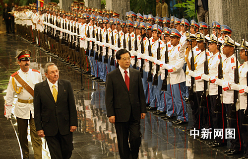 圖:勞爾·卡斯特羅舉行儀式歡迎胡錦濤