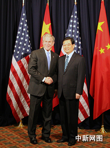 圖:胡錦濤同美國總統(tǒng)布什舉行會晤