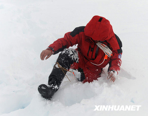 由于南極大陸周圍多年未化的“老冰”和剛剛結成的“新冰”混合一起,堵死了“雪龍”號前進的航線,25日晚6時,“雪龍”號有關負責人決定由船上隊員組成探冰隊下船察看冰情。