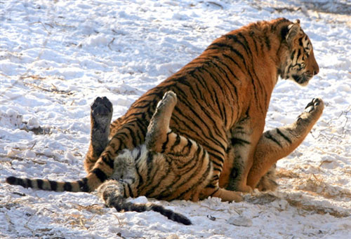 最不怕冷的“情侶”——1月,哈爾濱東北虎公園內(nèi)兩只老虎在戲耍。