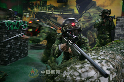 “戰(zhàn)場”氣氛非常逼真。伴著一陣急促的腳步聲,紅方首先發(fā)起攻勢。隊長一聲令下,狙擊手迅速占領制高點,機槍手在一個土堆后臥倒掩護,左側(cè)兩隊員手持步槍躍過矮墻,就勢一滾隱蔽到一邊。頭上機群盤旋俯沖,身邊爆炸聲此起彼伏,作為前出箭頭的列兵小周一個漂亮的滾進迅速躲過藍軍一串子彈,掩護跟進的小劉緊接著投出一顆手雷,兩名藍軍隊員應聲倒地。小劉心中暗喜,剛要向前方土坎躍進,卻被躲在碉堡里的藍軍狙擊手逮了個正著,頭盔紅光閃爍,無奈退出戰(zhàn)斗!皣}噠噠”一陣急促的槍聲,小周和藍軍李排長短兵相接,雙方同時掏出匕首準備“肉搏”。危急時刻,紅方狙擊手百步穿楊命中李排長,裁判員判李排長“犧牲”。再看小周,盡管是左躲右閃,卻還是被早已埋伏好的兩名藍軍夾擊,小周身上紅光閃閃,被判出局……。經(jīng)過激烈對抗,這場緊張的戰(zhàn)斗以紅方險勝藍軍而告終。