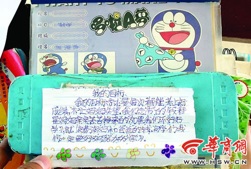 席海濤的文具盒上也有奮斗目標(biāo):“我的目標(biāo)是每次都能考上好成績,不讓媽媽失望,我們念書的錢都是媽媽辛辛苦苦掙來的,如果我們不好好學(xué)習(xí),就浪費(fèi)了媽媽和爸爸的錢,同學(xué)們我們一定要好好努力的學(xué)習(xí)。”