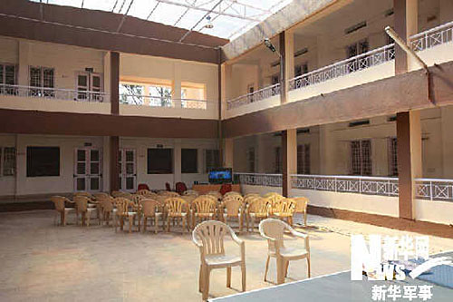 中方參訓(xùn)官兵的宿舍是棕灰色二層院落式樓房,中間有一個(gè)大天井,可以在這里集合或者進(jìn)行一些簡(jiǎn)單的娛樂(lè)。