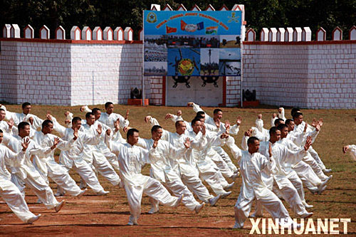12月6日,“攜手-2008”中印陸軍反恐聯(lián)合訓(xùn)練開(kāi)訓(xùn)。開(kāi)訓(xùn)儀式結(jié)束后,中印雙方進(jìn)行了武器裝備展示和訓(xùn)練課目演示。中方參訓(xùn)部隊(duì)進(jìn)行了太極拳、捕俘技術(shù)、反恐應(yīng)用射擊動(dòng)作的演示,印方參訓(xùn)分隊(duì)演示了木桿操、印度傳統(tǒng)武術(shù)等課目。參訓(xùn)雙方官兵精神振奮,配合默契。