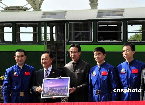 香港旅發(fā)局主席田北俊(中)向“神七”訪港代表團(tuán)贈紀(jì)念品。
