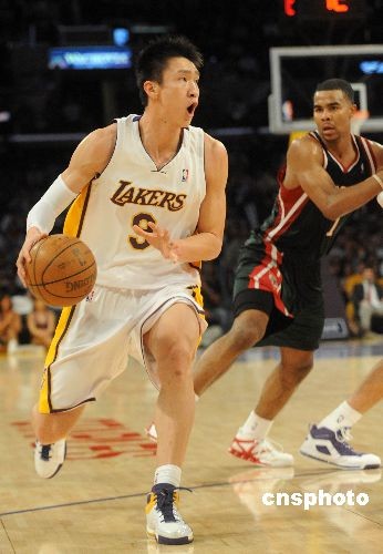當(dāng)?shù)貢r(shí)間十二月七日晚,NBA洛杉磯湖人隊(duì)在主場(chǎng)以一百零五比九十二輕取雄鹿隊(duì),中國(guó)球員孫悅首度在NBA常規(guī)賽上登場(chǎng),共取得四分。在終場(chǎng)前五分十三秒,孫悅上場(chǎng),每當(dāng)他拿球,整個(gè)斯坦普斯體育場(chǎng)內(nèi)歡聲雷動(dòng)。中新社發(fā) 張煒 攝