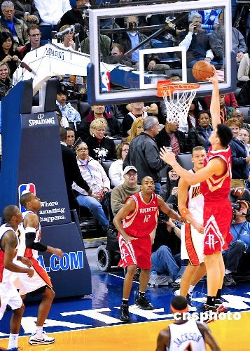 當?shù)貢r間12月12日晚,休斯頓火箭隊與金州勇士隊在加州奧克蘭主場甲骨文體育館進行一場比賽。姚明雖患感冒但仍拿下19分14個籃板,阿泰斯特因為右腳踝有傷休戰(zhàn),1號球星麥格雷迪復出首發(fā)并表現(xiàn)搶眼,最終火箭以119-108輕松戰(zhàn)勝對手取得兩連勝,時隔一周后再次大勝勇士。目前火箭總戰(zhàn)績達到15勝8負,勇士7勝16負。圖為姚明上籃。中新社發(fā) 陳鋼 攝
