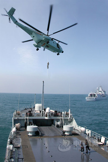 我軍特種部隊乘機(jī)機(jī)降到被“劫持”船只上 圖片來源:中國軍網(wǎng)