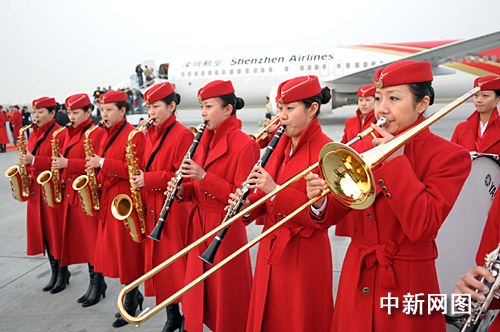 深航女子軍樂隊奏曲歡送臺灣旅客登機。