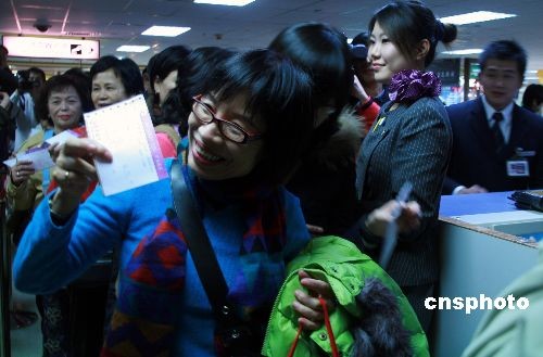 12月15日上午8時(shí),從臺(tái)北松山機(jī)場(chǎng)飛往上海的航班起飛,這是臺(tái)灣首班飛往大陸的平日包機(jī)。圖為旅客手持登機(jī)牌搭乘首航班機(jī)。