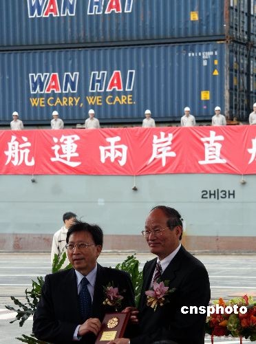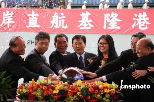 12月15日上午,臺灣行政當(dāng)局負(fù)責(zé)人劉兆玄率同“陸委會主委”賴幸媛、;鶗倍麻L高孔廉、“交通部次長”游芳來與臺灣知名航商負(fù)責(zé)人共同出席“兩岸海運直航基隆港首航儀式”。