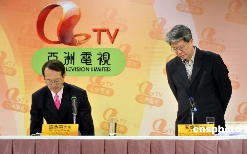 十二月十五日,香港亞洲電視執(zhí)行主席張永霖(左)、高級副總裁鄺凱迎在大埔總臺舉行的記者會(huì)上稱,二零零八亞洲小姐競選賽果與投票結(jié)果不符,亞視將對此進(jìn)行調(diào)查。圖為二人就事件鞠躬道歉。中新社發(fā) 鄧慶樂 攝