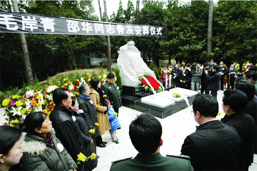 經(jīng)中央批準(zhǔn),毛岸青、邵華同志骨灰昨日(21日)下午由北京遷葬楊開慧烈士陵園,永遠(yuǎn)地留在了媽媽楊開慧烈士的身邊。“親愛的爸爸媽媽,今天我和妻子劉濱以及你們的孫子?xùn)|東,終于把你們送到了開慧奶奶的身邊,實(shí)現(xiàn)了你們的遺愿!”在骨灰安葬儀式上,毛岸青、邵華的兒子毛新宇動(dòng)情地說。省委書記、省人大常委會(huì)主任張春賢,省委副書記、省長周強(qiáng)向毛岸青、邵華同志敬獻(xiàn)了花籃。