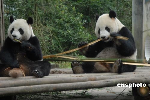 2008年12月,拍攝團(tuán)團(tuán)圓圓坐在樹枝上 ,一同甜蜜吃竹子。中新社發(fā) 羅小韻 攝