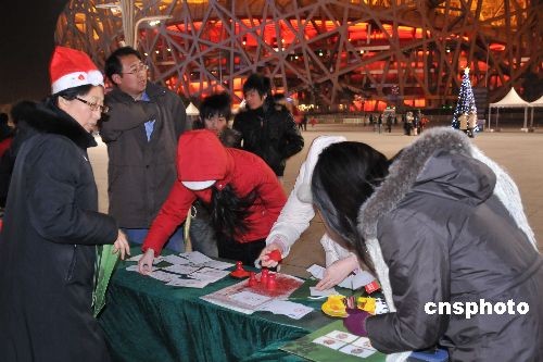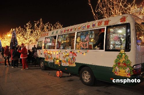 12月24日晚,一輛“圣誕郵車”來到北京奧林匹克公園中心區(qū)景觀大道一側(cè),在平安夜為廣大游客服務,給親朋好友送上美好的祝福。中新社發(fā) 馮軍 攝