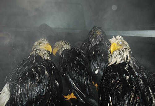 一群濕漉漉的禿鷹,獲得“濕漉漉的野生動物”獎(jiǎng)的第二名。