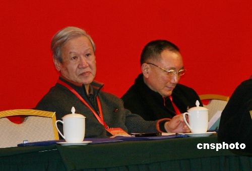 著名導(dǎo)演謝飛(左)、中影集團(tuán)董事長韓三平在主席臺就坐。 中新社發(fā) 黃寧 攝