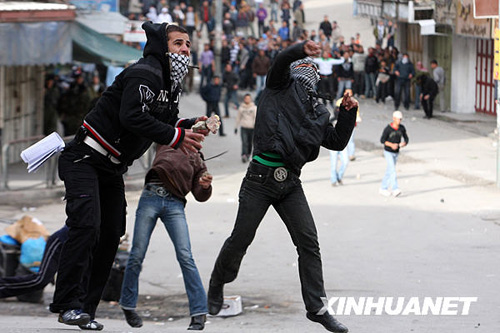 12月27日,在約旦河西岸城鎮(zhèn)希伯倫,巴勒斯坦人向以色列士兵投擲石塊。當(dāng)日,上百名巴勒斯坦人在希伯倫抗議以軍空襲加沙,并與以色列士兵發(fā)生沖突。新華社記者 殷博古 攝