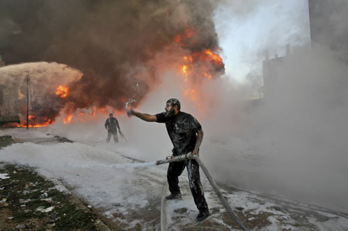 一名巴勒斯坦人在試圖撲救爆炸引起的大火。
