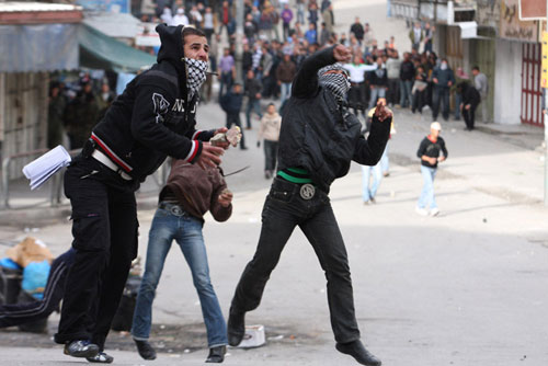 巴勒斯坦人向以色列士兵投擲石塊。27日,上百名巴勒斯坦人在希伯倫抗議以軍空襲加沙,并與以色列士兵發(fā)生沖突。