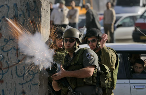 以色列邊防警察向投擲石塊的巴勒斯坦示威者施放催淚彈。
