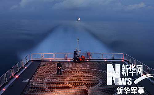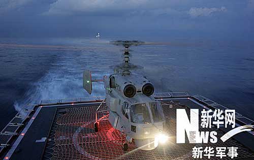 12月28日夜,中國赴亞丁灣、索馬里海域護航編隊首次組織夜間直升機行進間著艦訓練。張朋 攝