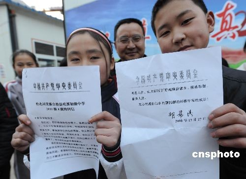 12月29日,四川地震極重災(zāi)區(qū)的北川縣桂溪中學(xué)師生喜獲胡錦濤總書記的回信。吳天春校長和同學(xué)們兩天前受到胡總書記的看望,一位羌族女學(xué)生向臨告別時(shí)的總書記送上一封信和學(xué)校震后重建規(guī)劃圖的賀年片,兩天后就收到從成都轉(zhuǎn)來總書記的回信。中新社發(fā) 賈國榮 攝