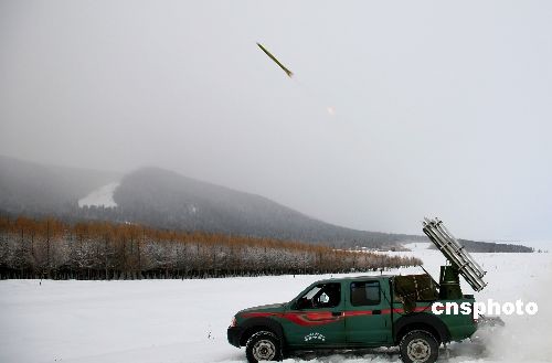 12月27日,新疆哈密一輛人工增雪車正在發(fā)射增雪火箭彈。