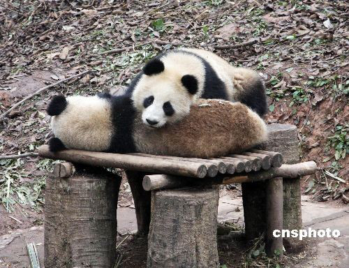 兩只熊貓?jiān)谘虐脖谭鍗{熊貓基地豹子山悠閑玩耍。。