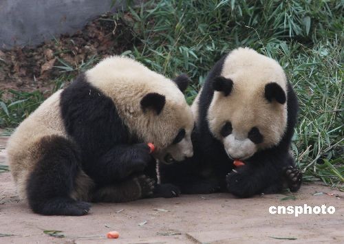 兩只幼熊貓?jiān)谘虐脖谭鍗{熊貓基地熊貓幼兒園吃食物。 中新社發(fā) 郭國權(quán) 攝