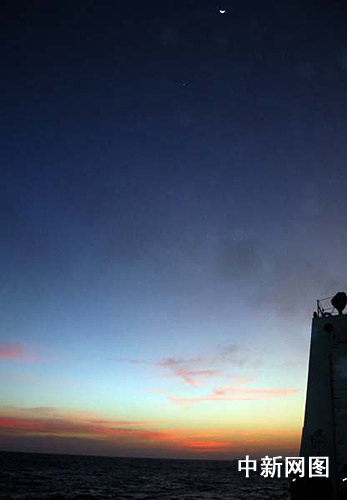 1月2日,中國海軍護航艦艇編隊繼續(xù)在印度洋航行,圖為航行途中在“?凇迸炆纤臄z的印度洋晚霞映月景觀。 中新網記者 孫自法 攝
