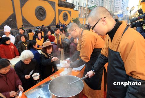 1月3日,適逢中國農(nóng)歷十二月初八傳統(tǒng)的“臘八節(jié)”,上海佛教界向民眾首次施贈臘八粥。圖為一大早,數(shù)千市民在百年古剎玉佛禪寺山門前排起長隊(duì),等候品嘗熱氣騰騰的臘八粥,祈福來年國泰民安。