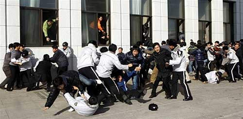 1月3日,在韓國首都首爾,警察(穿灰白色上衣者)阻止反對(duì)黨成員爬窗進(jìn)入國會(huì)。韓國主要反對(duì)黨民主黨議員自2008年12月26日起占據(jù)了國會(huì)大會(huì)議廳內(nèi)的議長座位,以阻止執(zhí)政的大國家黨單方面通過一系列有爭議法案。