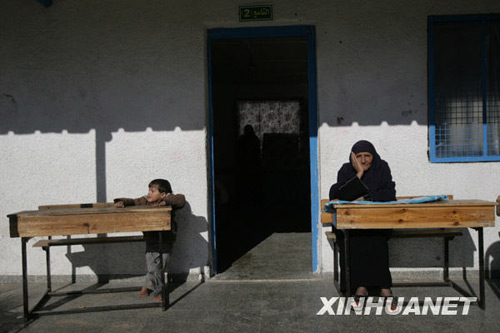 1月3日,在加沙地帶南部拉法,一名巴勒斯坦男孩(左)和家人臨時(shí)寄居在一個(gè)難民營的學(xué)校里。
