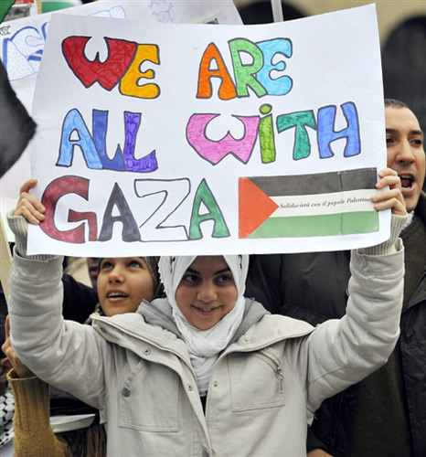 1月3日,在意大利米蘭,當(dāng)?shù)厝罕娕e行集會活動,對在加沙地區(qū)遭空襲的巴勒斯坦死難者進(jìn)行祈禱,抗議以色列襲擊加沙。