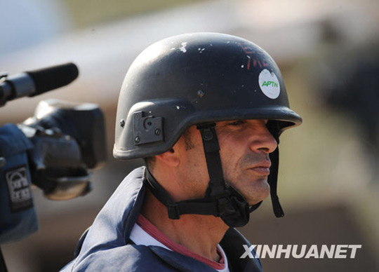 1月4日,一名頭戴鋼盔、身穿防彈衣的記者在加沙邊境地區(qū)的一座小山上眺望加沙北部地區(qū)。自以色列2008年12月27日開始空襲加沙地區(qū)以來,來自世界各地的數(shù)百名記者匯聚巴以地區(qū)進行報道。