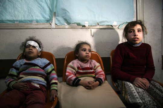 在以色列攻襲加沙中受傷的巴勒斯坦女孩在醫(yī)院外等候。6日,以色列部隊攻擊了聯(lián)合國在加沙地區(qū)設(shè)立的學(xué)校,造成數(shù)十人死亡。