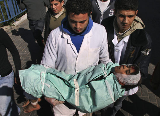 巴勒斯坦醫(yī)護(hù)人員懷抱著一具孩子的尸體。6日,以色列部隊(duì)攻擊了聯(lián)合國(guó)在加沙地區(qū)設(shè)立的學(xué)校,造成數(shù)十人死亡。