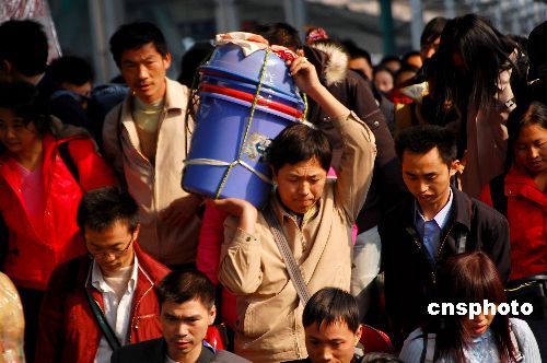2009年1月10日,重慶北火車站迎來第一波春運客流高峰。由于外出務(wù)工人員提前返鄉(xiāng),各大高校開始放假,民工流和學(xué)生流融合,重慶火車站在春運前夕迎來了首個客流高峰,重慶市各大汽車站、火車站當(dāng)日都增開了加班車和臨客。2009年全國春運從1月11日開始,到2月19日結(jié)束,共計40天。中新社發(fā) 許康平 攝