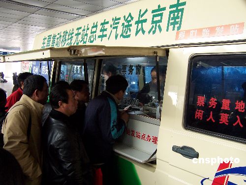 2009年1月10日,旅客在南京市一輛流動(dòng)售票車前排隊(duì)購買春運(yùn)汽車票。春運(yùn)來臨,江蘇省南京市交通運(yùn)輸部門在車站廣場和市區(qū)繁華路段設(shè)立了流動(dòng)售票車,既緩解了車站集中售票的人流壓力,又使旅客體驗(yàn)到了春運(yùn)購票的便捷。中新社發(fā) 王啟明 攝
